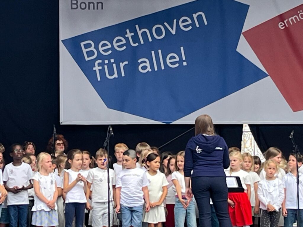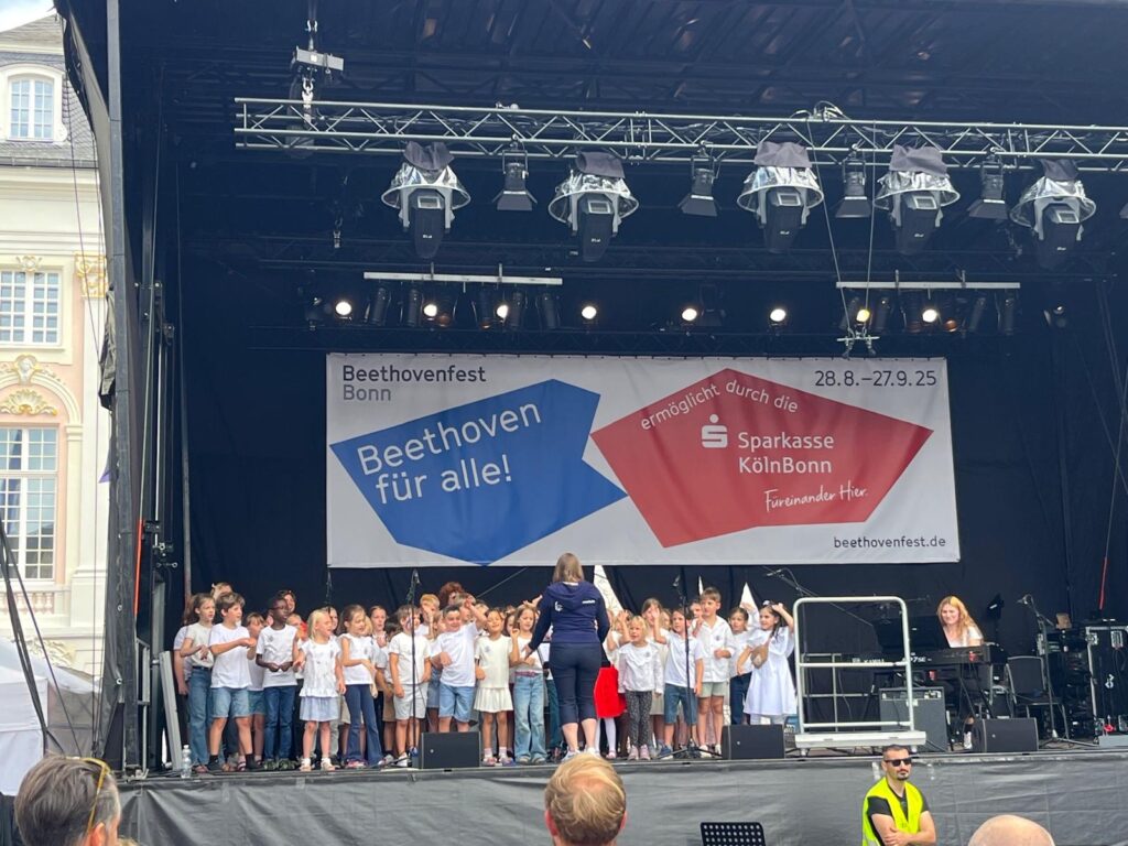 Auch in diesem Jahr war die KGS Beethovenschule wieder prominent auf dem Beethovenfest vertreten. Unter der Leitung von Kim Kott präsentierten 50 Schülerinnen und Schüler sieben Lieder aus dem Repertoire der SingPause. Ganz prominent – von der Haupt-Bühne auf dem Marktplatz vor dem Alten Rathaus der Stadt Bonn aus – begeisterten sie das zahlreiche Publikum. Begleitet wurden die Schülerinnen von Schulleiterin Astrid-Knop-Kurpiers, Anja Hoschützky und Dagmar Wagner.