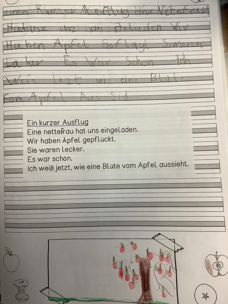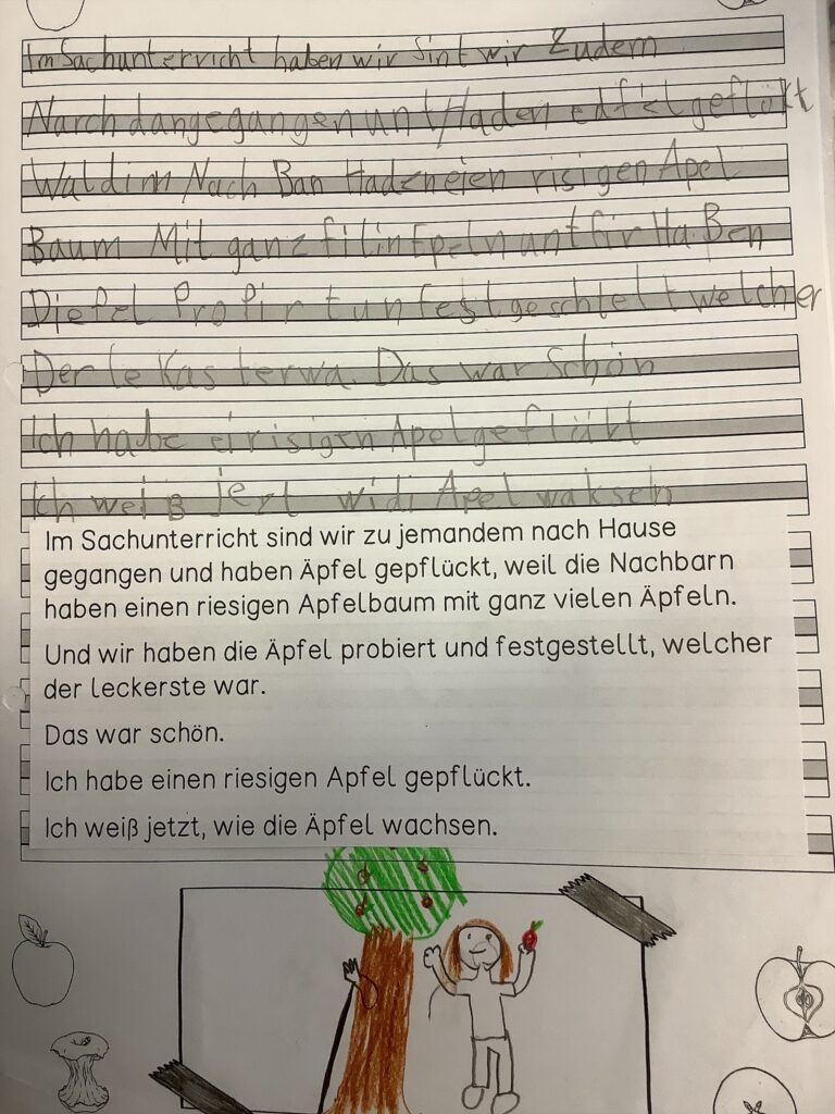 Die Kinder der Eulenklasse haben im Sachunterricht viel über den Apfel gelernt. Zum Abschluss wurden sie von einer Nachbarin eingeladen, in ihrem Garten Äpfel zu pflücken.