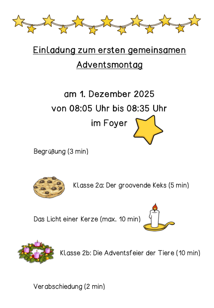 Bereits am ersten gemeinsamen Adventsmontag im Dezember eröffneten die Klassen 2a und 2b die Reihe der Feiern mit liebevoll vorbereiteten Beiträgen. Geschichten wie „Der groovende Keks“ oder „Die Adventsfeier der Tiere“ sorgten für Schmunzeln und stimmten die Schulgemeinschaft auf die kommende Zeit ein. Ein besonderer Moment war dabei das Weitergeben des Lichts einer Kerze, das symbolisch für Gemeinschaft und Zusammenhalt stand.