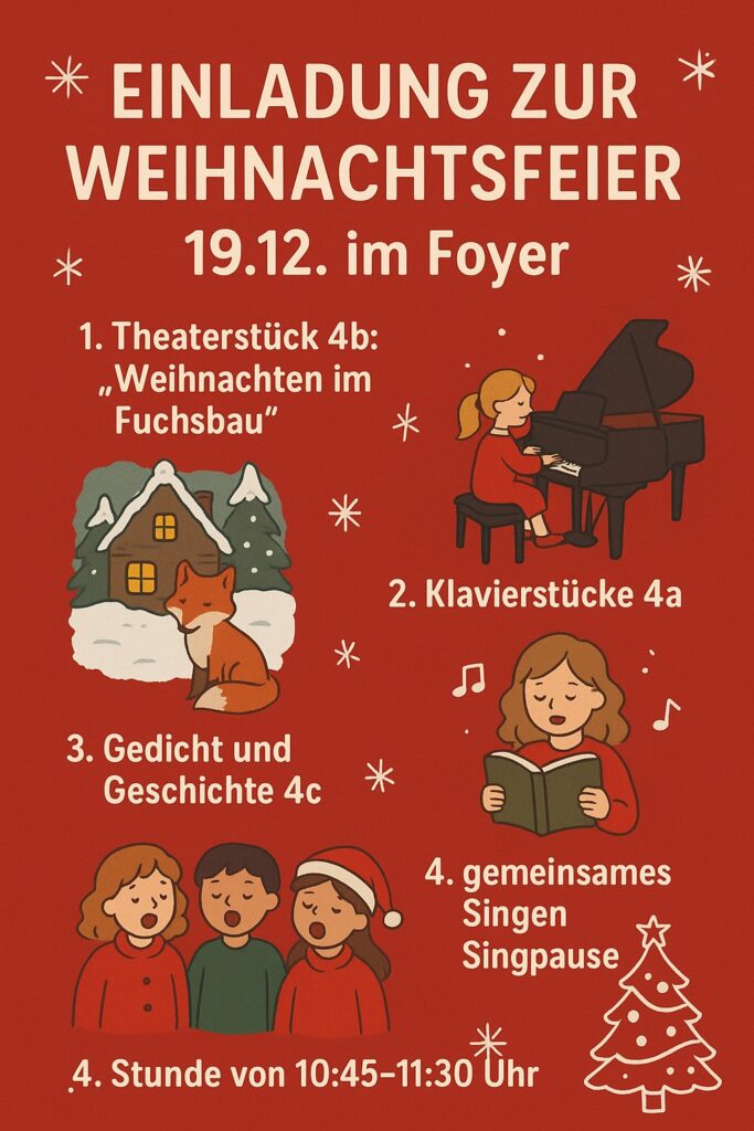 Auch in den folgenden Wochen gestalteten die Klassen die Feiern mit viel Engagement. Es gab Wichtelgeschichten, Gedichte, kleine Vorspiele sowie musikalische Beiträge. Das Schulorchester sorgte ebenso für festliche Klänge wie einzelne Kinder, die mutig Klavierstücke vortrugen. Besonders beeindruckend war das Theaterstück „Weihnachten im Fuchsbau“, das die Kinder der Klasse 4b aufführten.